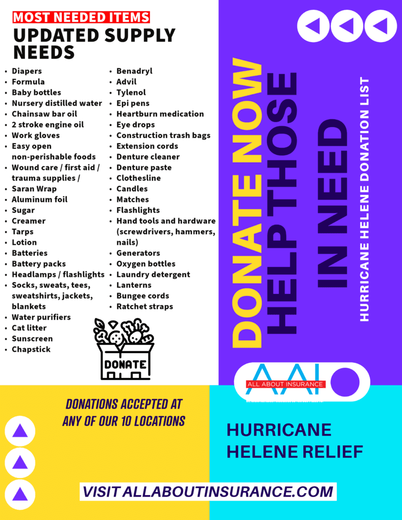 Drop off your donations at any of our locations today—every bit helps, and together, we can support our neighbors in their time of need. Reach out to All About Insurance for more details on how you can help!